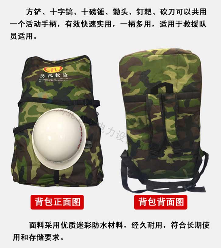 防汛搶險組合式工具包特點:靈活性好,質量可靠,可在惡劣的環境下單兵背負作業,攜帶方便,體積小、相互結合該組合工具配備齊全適用于救援隊員適用。可根據需求定制產品配件及功能性。