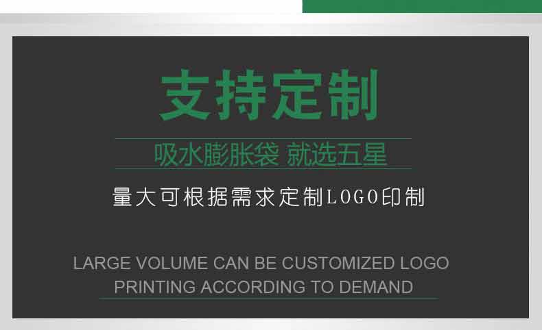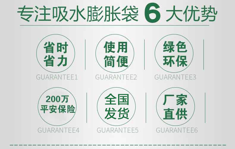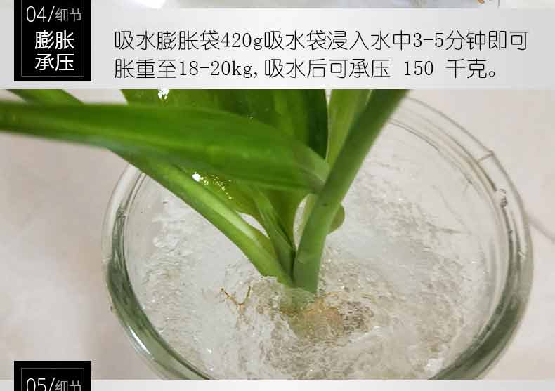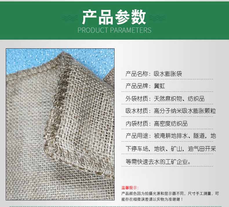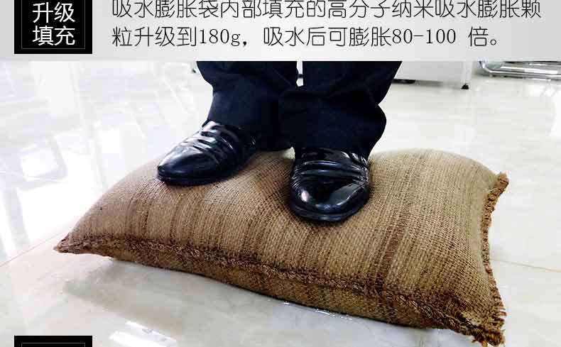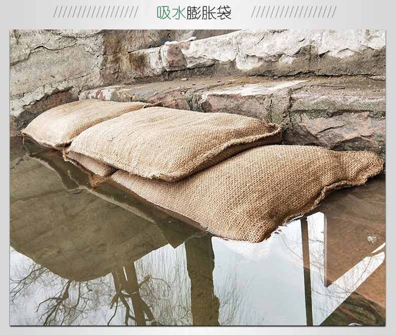 吸水膨脹袋內裝的是新型的高分子納米吸水物質,這種物質無毒、無味、無污染,吸水膨脹前為極小的顆粒物質,吸水后為黑豆大小的含水物質,干凈且無公害,待高分子吸水物質使用后可用于農業(yè)保水抗旱,所以在洪水過后可就地將袋內的物質傾倒入農田中,在泥土中可完全分解,是綠色環(huán)保、一舉兩得的首選產品。外袋為純麻布和棉布織成,遇水后麻繩可更加結實耐磨。