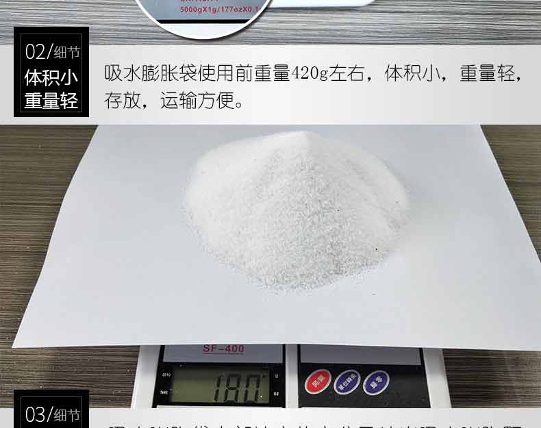 以水治水,快速膨脹,管涌以及快速構筑擋水壩,封堵缺口,替代沙袋,替代沙袋和編織袋。操作簡單,攜帶運輸方便,遇水膨脹速度快,浸入水中 3 分鐘即可迅速膨脹至 18 ~ 20 千克,吸水膨脹袋 經現場測試比沙土包堵截速度快9倍,使用時只需一人就可以完成,勞動強度大為減輕,無毒,無害,無味,無污染,可自然降解