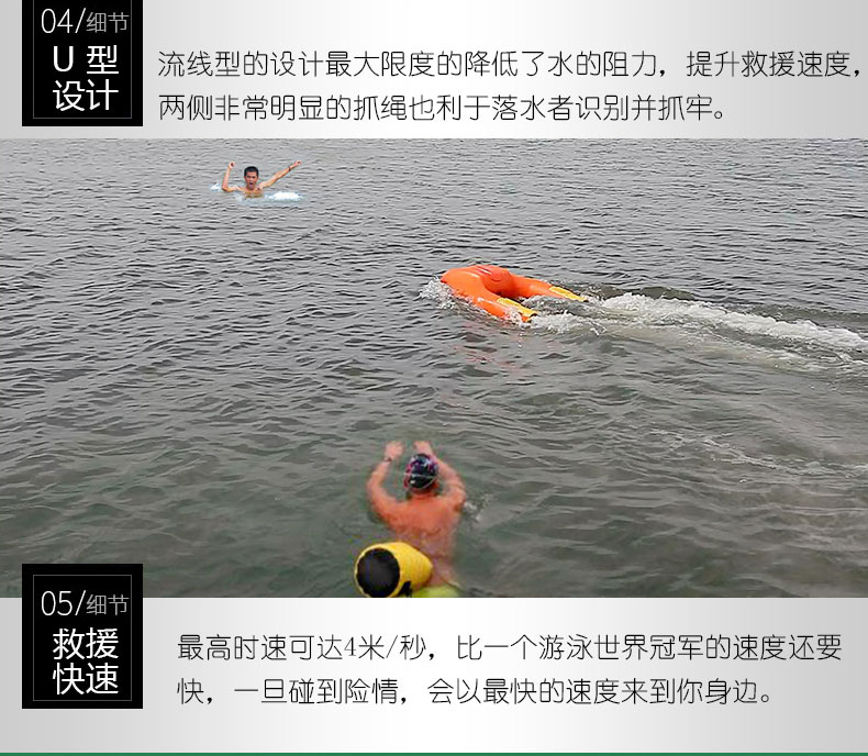 智能遙控救生器,外殼采用耐磨性、電絕緣性、韌性及耐寒性好的HDPE材料制作,適應各種不同惡劣環境,目前搭配的動力系統是安全性很好的鋰電池集成系統,使用安全,內置9軸陀螺儀,可以識別姿態信息,自動切換左右,海浪沖翻后也能恢復姿態并保持航線運行。