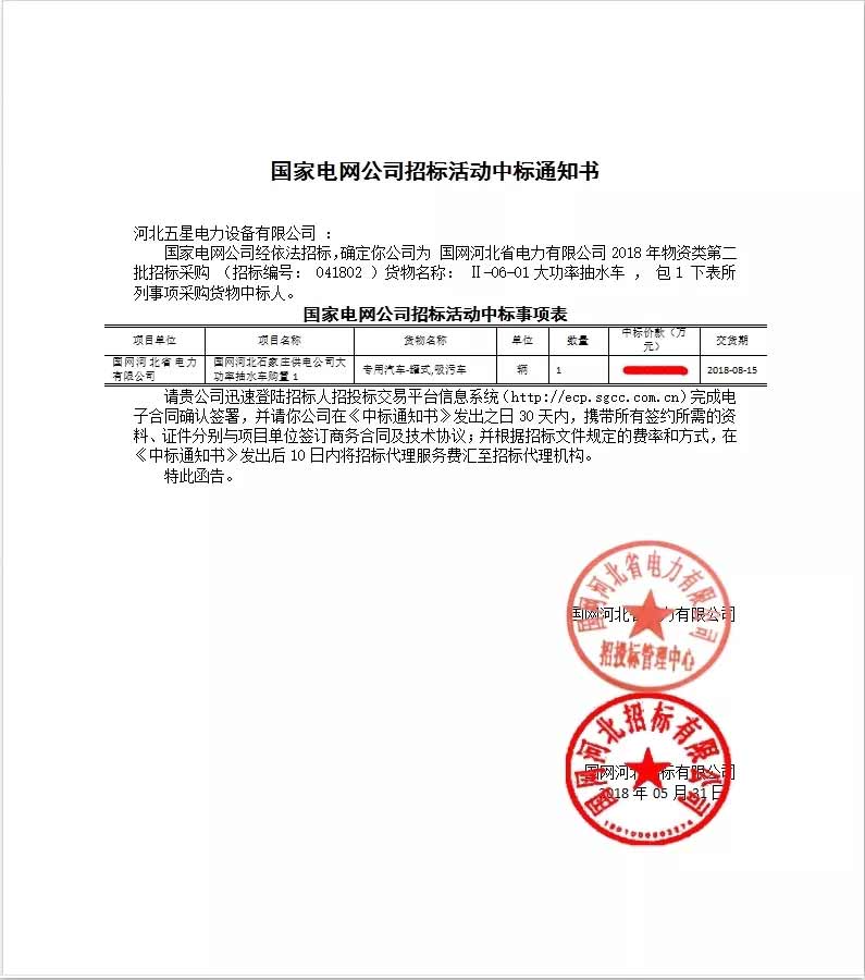國家電網(wǎng)公司經(jīng)依法招標(biāo),確定河北五星公司為國網(wǎng)河北省電力有限公司“”2018 年物資類第二批招標(biāo)采購 (招標(biāo)編號: 041802 )”項(xiàng)目中,河北五星研制生產(chǎn)的“大流量應(yīng)急搶險(xiǎn)排澇車”一舉中標(biāo)!!